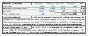 - Por flujos obtengo un precio objetivo para 2025 de 0,50€/Acc. Por múltiplos, espero que el resultado se vaya a los 0,06€/Acc en 2025 (aunque seguramente será negativo) que supone una reducción del -25% sobre el BPA ordinario (sin la sanción de 116M€) de 2024 y habría que aplicar un PER 8 para llegar a 0,48€/Acc que es su precio objetivo.